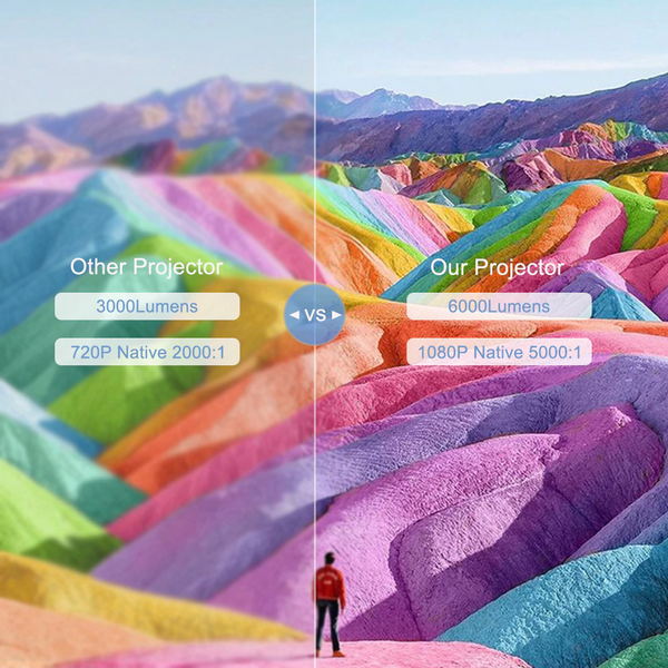 Nuestro proyector utiliza la luz LED brillante y la tecnología de pantalla LCD, con un alto brillo de 6000 lúmenes que proporciona un brillo significativamente superior al 60+%